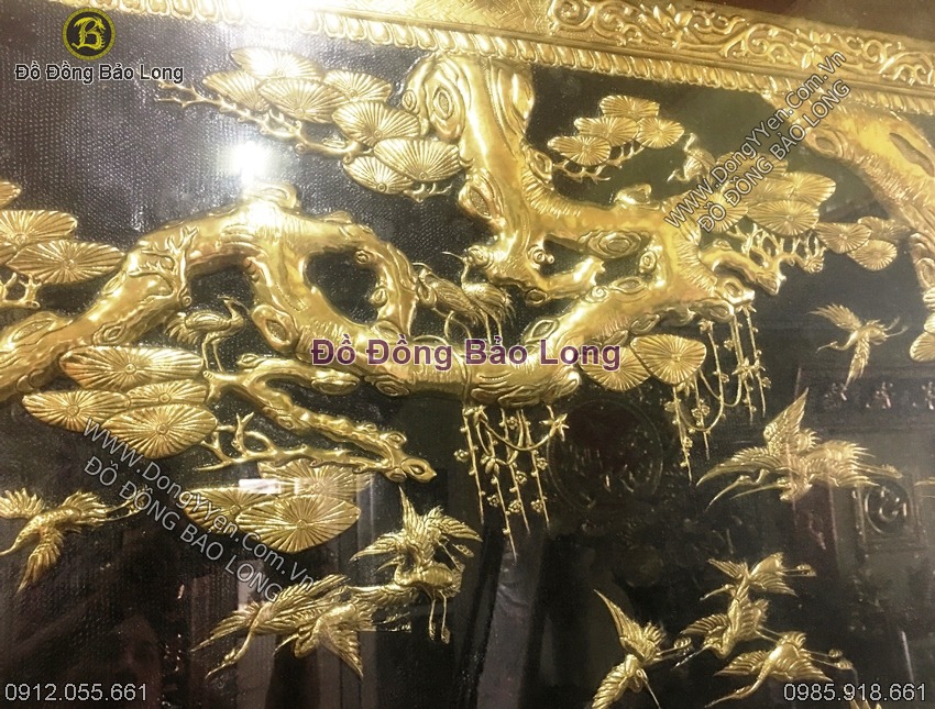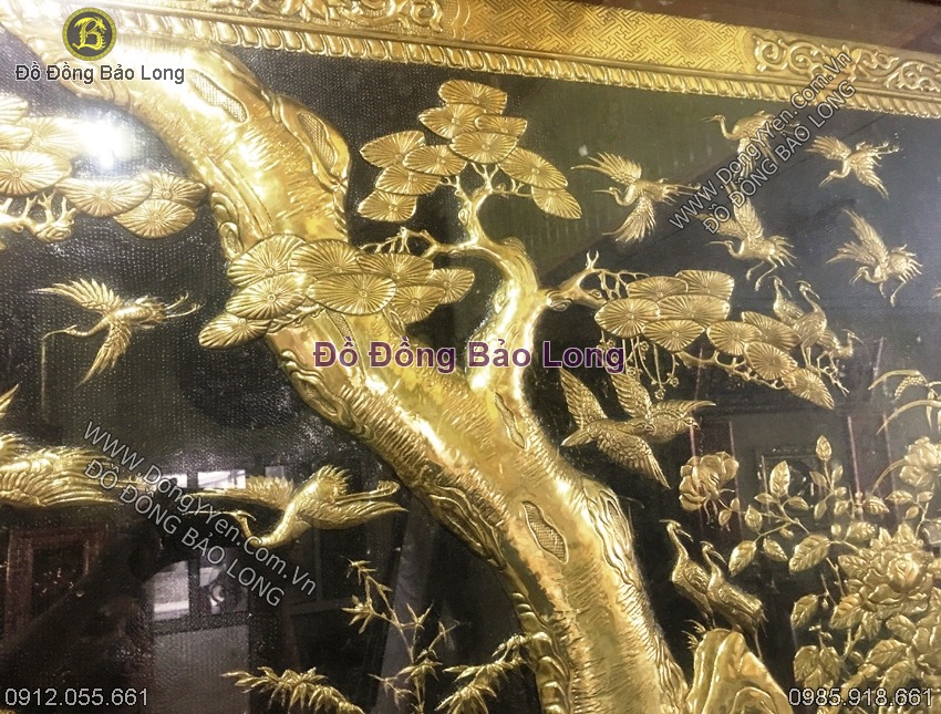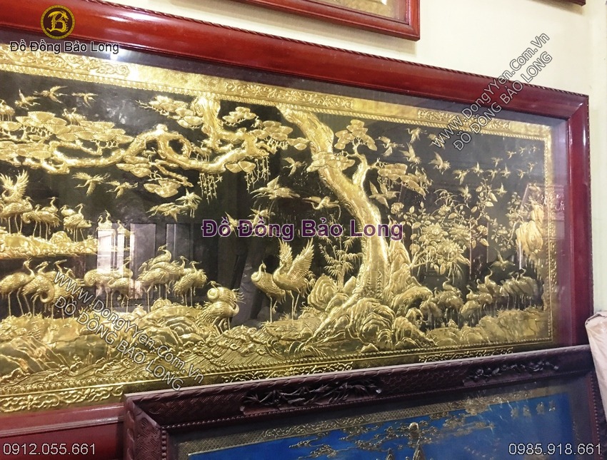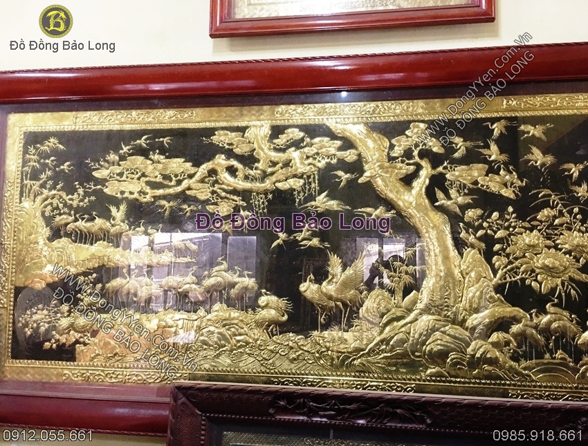 Tranh Tùng Hạc Diên Niên 100 con hay còn gọi là tranh Bách Hạc Quần Tùng hàng cao cấp được chạm thủ công bằng tay từ đồng tấm (nhập hàn quốc) dày 8rem, khổ tranh dài 3m21 cao 1m47 khung gỗ trò chống mối mọt cong vênh màu cánh dán cực đẹp và đẳng cấp. Tranh này khách một chút so với Tranh Bách Hạc Quần Tùng 3m21 đã giới thiệu trước đó. Tranh bách hạc diên niên 100 con này chỉ có 1 cây Tùng đại thụ ở chính giữa, lấy bố cục 1 cây tùng già quá lớn chỉ phác họa được 1 phần cây và cành và 100 con hạc đang bay lượng quần tụ khổ tranh kéo dài ra nhìn rất có chiều sâu. Tranh Tùng hạc diên niên 100 con khổ dài này rất phù hợp để treo tại các biệt thự, sảnh lớn hoặc nahf riêng có diện tích rộng. Bức tranh vừa mang ý nghĩa phong thủy rất tốt vừa bày trang trí rất hoành tráng.