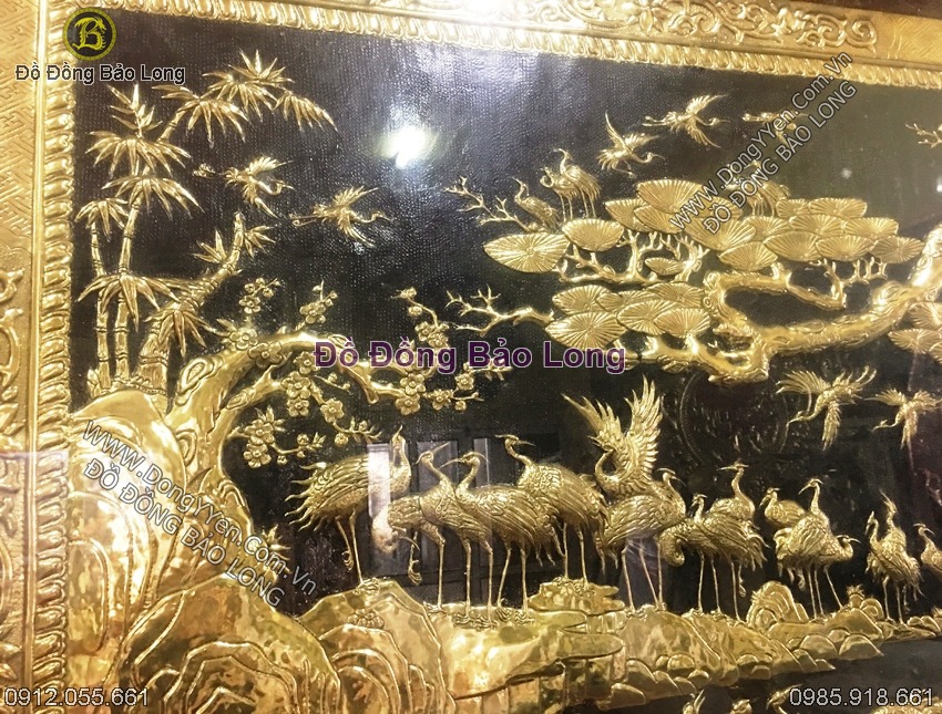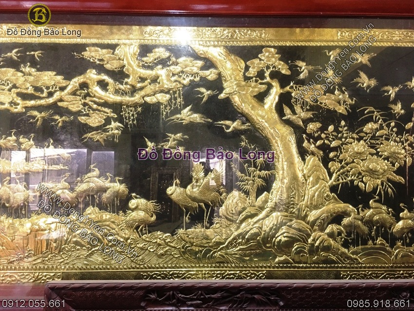 Tranh tùng hạc diên niên 100 con hay tranh bách hạc quần tùng hàng cao cấp chạm tay thủ công bằng đồng vàng dày 8rem, khung gỗ trò cực đẹp