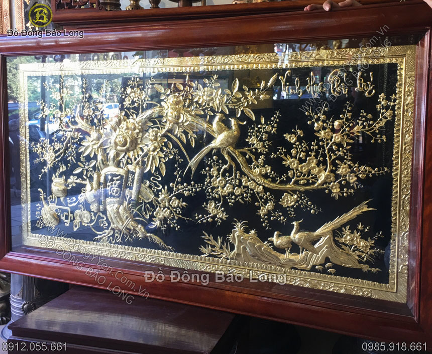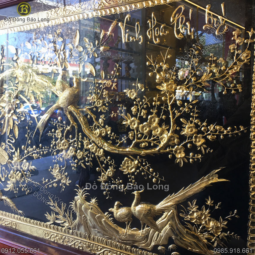 Bức Vinh Hoa Phú Quý hàng chạm tay tinh xảo bằng đồng vàng dày 8rem, khung gõ gụ khổ 1m55x88cm được mạ vàng 24k bằng phương pháp điện phân cao cấp nhất hiện nay.