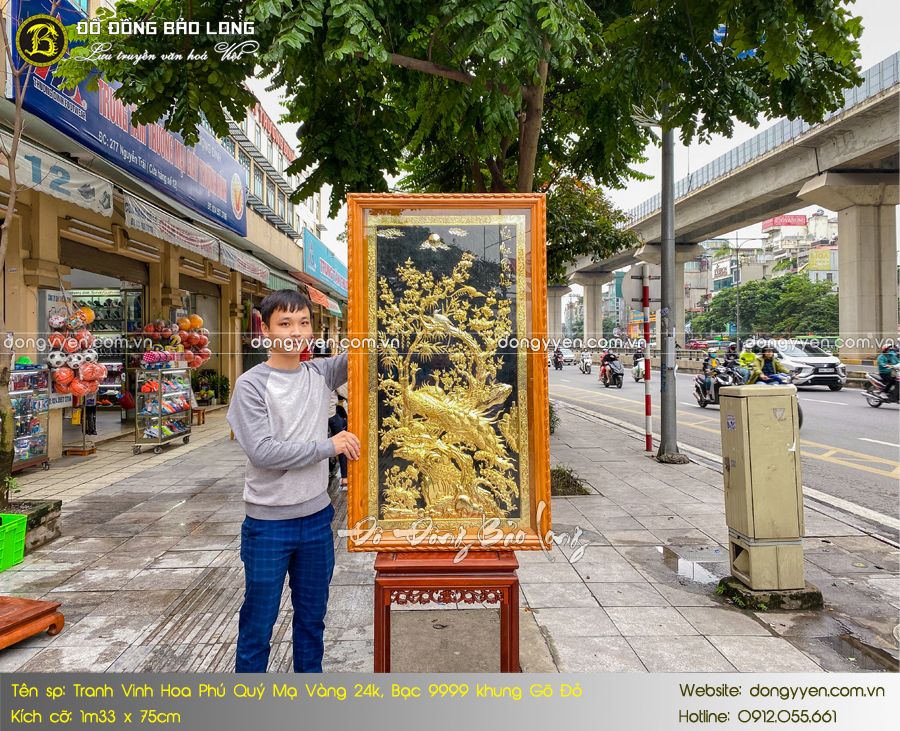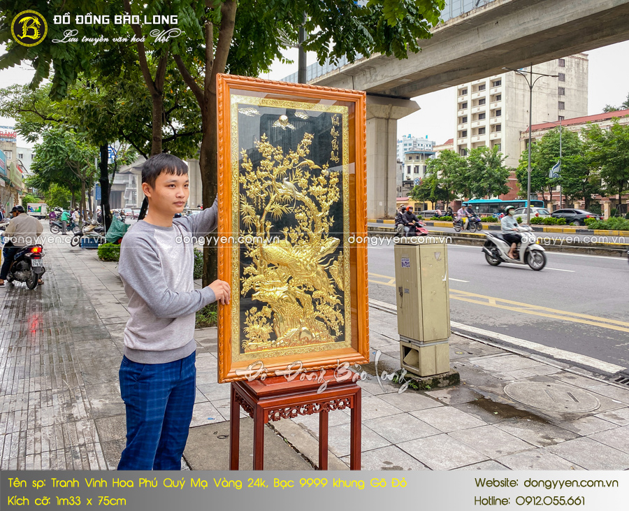 Tranh Vinh Hoa Phú Quý mạ vàng dát bạc 1m33 x 75cm dáng đứng được chế tác thủ công hoàn toàn, bề mặt được xử lí khéo léo. Bức tranh không chỉ có vẻ đẹp độc đáo và còn có ý nghĩa phong thủy tốt.