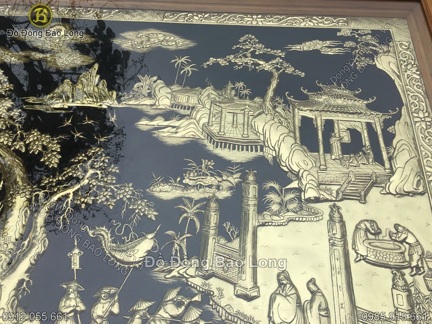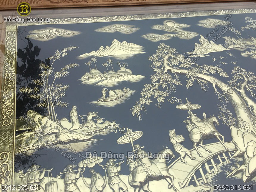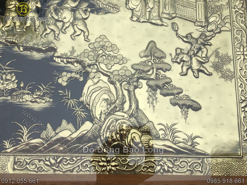 Đây là bức tranh thuộc loại hàng đặt tinh xảo cao cấp, làm theo kích thước yêu cầu của khách hàng khổ tranh 2m32x1m76 đóng trong khung gỗ gụ đục tứ quý, tranh chạm tinh xảo bằng đồng vàng dày 8 rem, nặng chừng gần 100kg, nền tranh cực phẳng làm rất tỉ mẩn, đường nét tinh tấn đền từng chi tiết nhỏ.