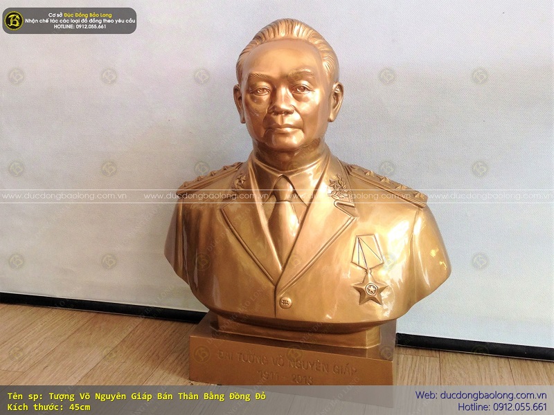 Đây là một trong những mẫu tượng Bác Giáp bán thân bằng đồng đỏ cao 45cm đẹp nhất do cơ sở Bảo Long chế tác, tượng được đúc hoàn toàn thủ công bằng đồng đỏ thanh khiết, cao 45cm nặng chừng 15kg đồng đỏ, màu ốc bươu tạo ra từ quá trình dội nước đồng sun phát. Tượng được đúc theo mẫu chuẩn đẹp, nét mặt đạt giống đến 95%, thể hiện được thần thái, tầm vóc của 1 nhà quân sự lỗi lạc, tài ba.