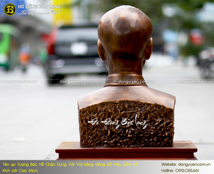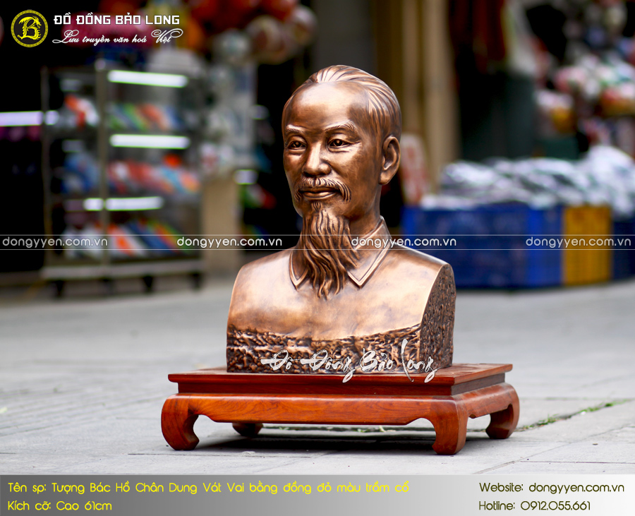 Tượng chân dung Bác Hồ vát vai bằng đồng đỏ màu trầm cổ 61cm là mẫu tượng mới nhất của Đúc Đồng Bảo Long. Sản phẩm chế tác theo mẫu chuẩn Quốc gia, hiện được trưng bày tại nhiều cơ quan, phòng thờ và đài tưởng niệm. Bề mặt tượng tạo màu hun giả cổ rất trang nghiêm và cho độ bền màu cao.