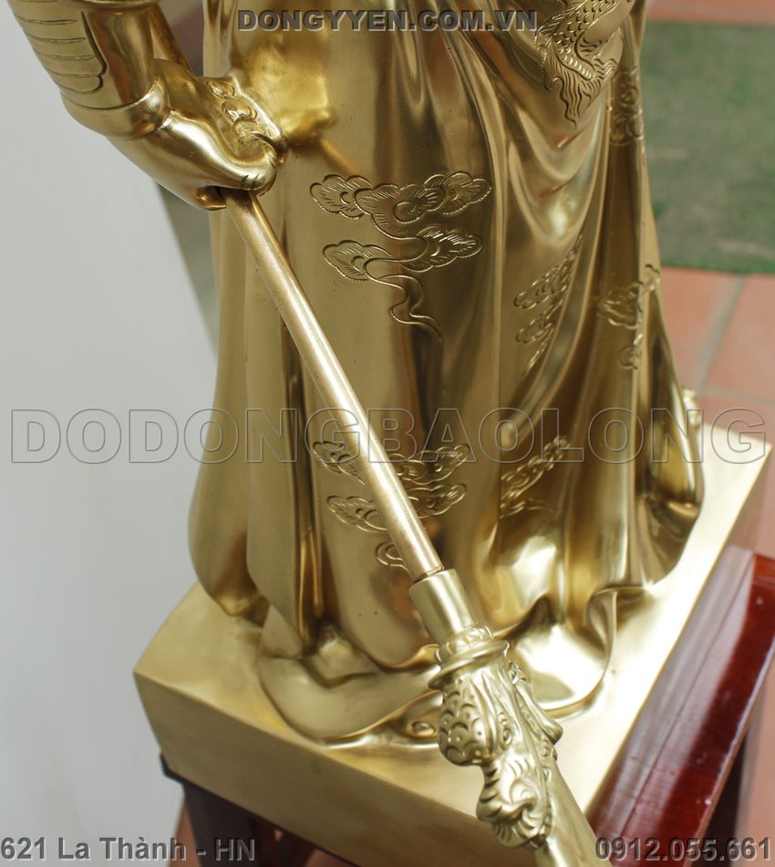 Đây là mẫu tượng thuộc hàng đặt cao cấp chuẩn đồng nổi khi đánh bóng tượng lên màu vàng như màu cát tút cực đẹp. Đúc tượng quan công ngoài khuôn mẫu phải thật nhuyễn, nguyên liệu chuẩn thì để được một pho tượng đẹp ưng ý phải cần đến khâu làm nguội tốt. Quá trình gia công làm nguội tượng ngốn rất nhiều thời gian công sức. Phôi đồng sau khi đúc được các bàn tay điêu luyện của những người thợ xử lý hết sức tỉ mỉ, kỳ công trên bề mặt, góc cạnh...bằng việc bù lỗi, chạm vẽ các hoa văn, chỉnh sửa cho khuôn mặt có hồn, có thần sắc đến khi nào ưng ý theo mắt thợ mới chuyển sang đánh bóng. Chỉ riêng khâu đánh bóng thôi cũng phải trải qua 8 lần với 8 cấp giấy ráp từ thô đến mịn dần. Với việc chế tác tượng công phu như vậy chúng tôi tin chắc sẽ đảm bảo đáp ứng được những yêu cầu khó tính nhất của quý khách hàng. Thời gian đặt hàng tượng đồng quan công hàng kỹ thông thường từ 20-30 ngày tùy yêu cầu.