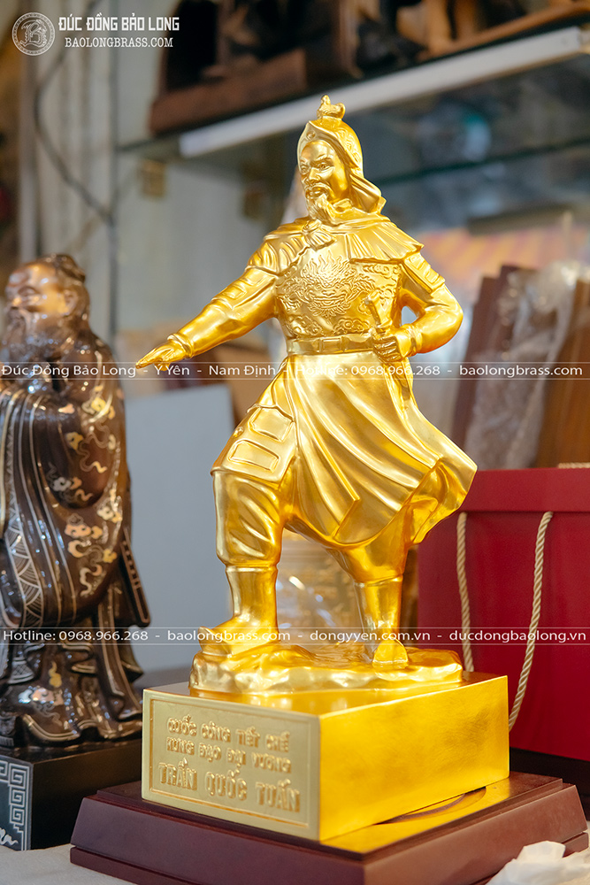 Pho tượng Trần Hưng Đạo bằng đồng được dát vàng 9999 toàn bộ tại Đúc Đồng Bảo Long là dòng sản phẩm cao cấp, được chế tác bằng đồng thanh khiết đảm bảo, kết hợp dát vàng 9999 trên bề mặt, kết hợp tạo màu, phủ bóng 2k trong suốt bề mặt cách ly hoàn toàn đồng với môi trường, cho độ bề đẹp cùng thời gian. Sản phẩm có độ bền vĩnh cửu cùng thời gian.