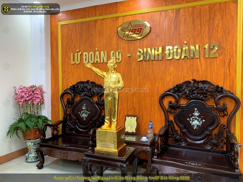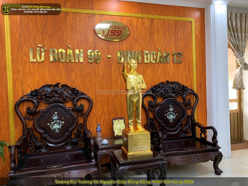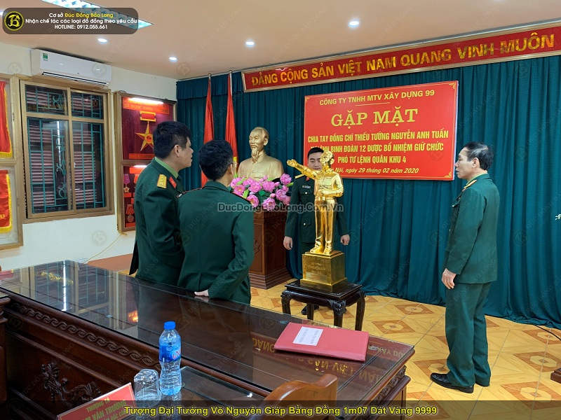 Tượng đại tướng Võ Nguyên Giáp đưng chỉ huy cao 1m07 được cơ sở Bảo Long tạo tác theo mẫu chuẩn, đúc thủ công bằng đồng đỏ thanh khiết, dát vàng 9999 cực đẹp, đã bàn giao đến tay khách hàng.
