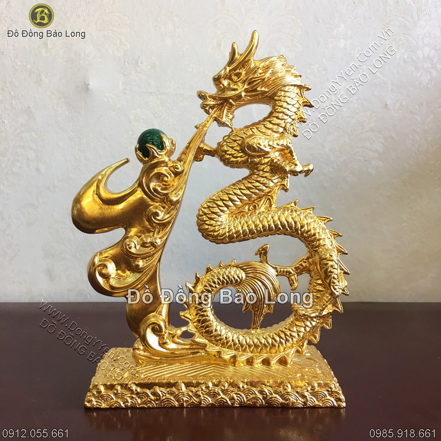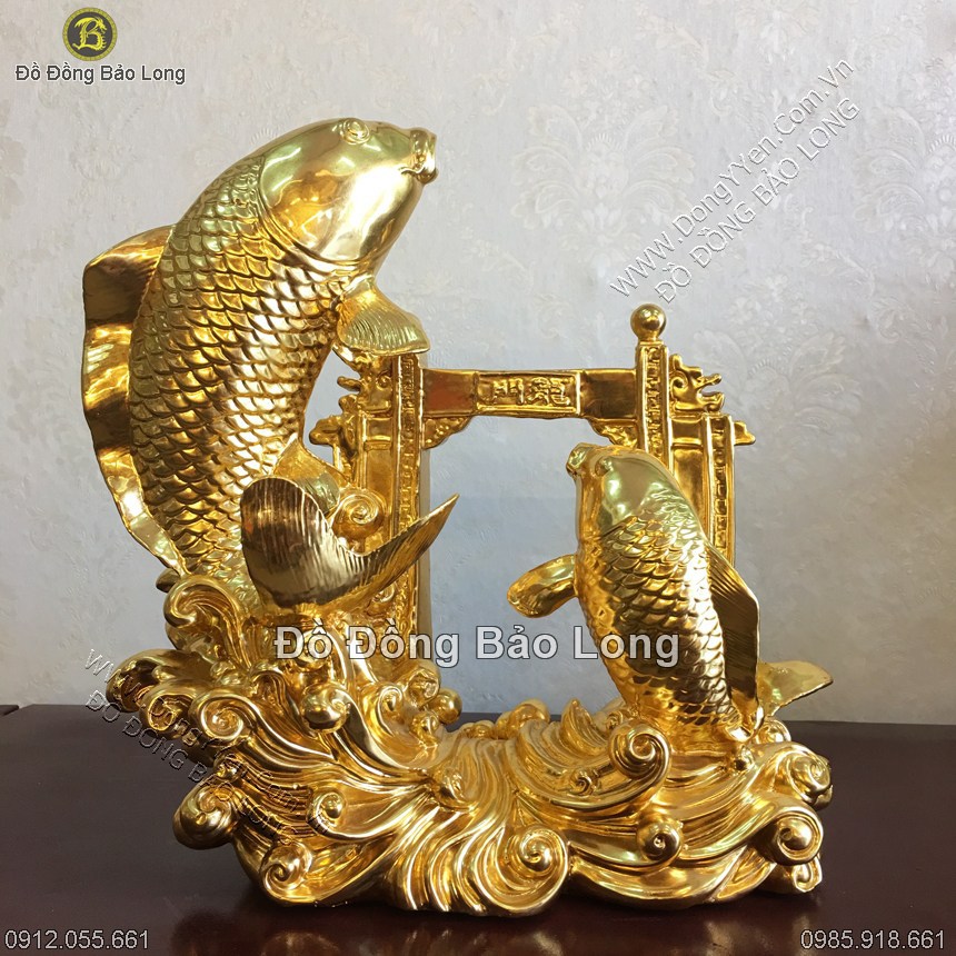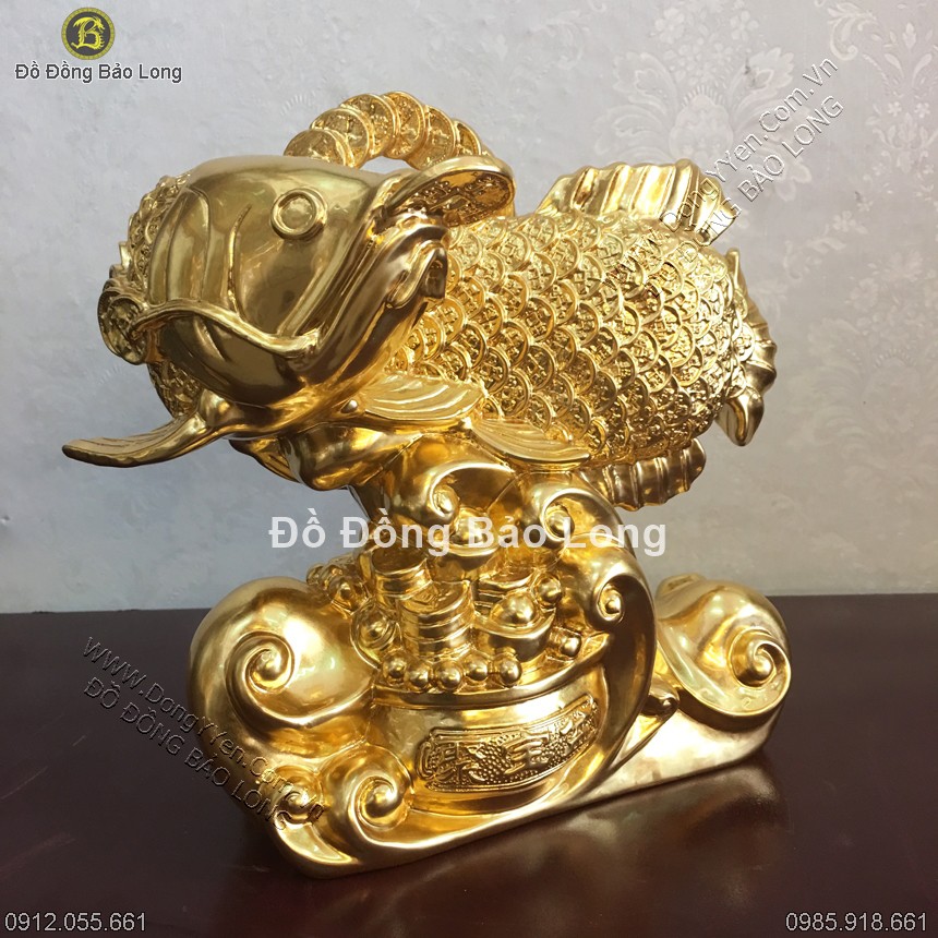 Tượng Cá Rồng cao 23cm, dài 25cm được đúc nguyên bản bằng đồng thau tinh xảo tư thế cá đang bơi cong người, toàn bộ mình cá rồng được dát vàng (thếp vàng quỳ 9999) cực kỳ đẳng cấp và đẹp mắt. Cá Rồng được mệnh danh là loại cá kiểng qúy tộc bởi so với các loại cá kiểng khác thì cá Rồng có giá đắt hơn nhiều. Cá Rồng có thân hình đẹp với màu sắc lấp lánh, đặc biệt là có vảy giống vảy của con rồng nên được gọi là cá Rồng.