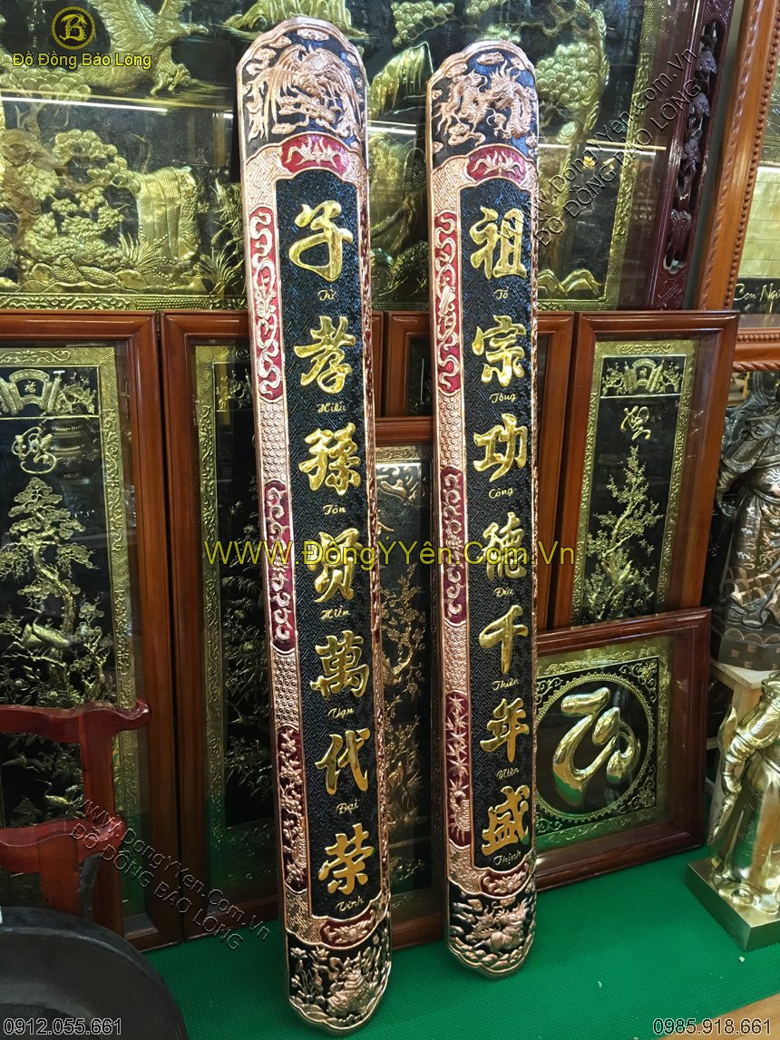 Cuốn Thư Câu Đối Bằng Đồng được chạm thủ công bằng tay từ chất liệu đồng dày nguyên tấm, kích thước phổ biến 1m35, 1m55, 1m76 dùng trong thờ cúng gia tiên, phòng thờ, điện thờ, từ đường nhà thờ họ, đền, chùa...